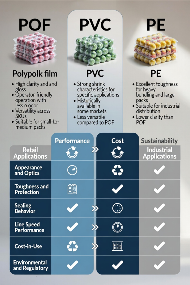 غالبًا ما تتم مقارنة POF مع PVC وPE لأن هذه المواد تغطي معظم تطبيقات الانكماش في جميع أنحاء العالم. يعتمد الاختيار الأفضل على التوازن الذي تحتاجه بين المظهر والمتانة وسلوك الختم وتكلفة الاستخدام والإدراك/التنظيم.